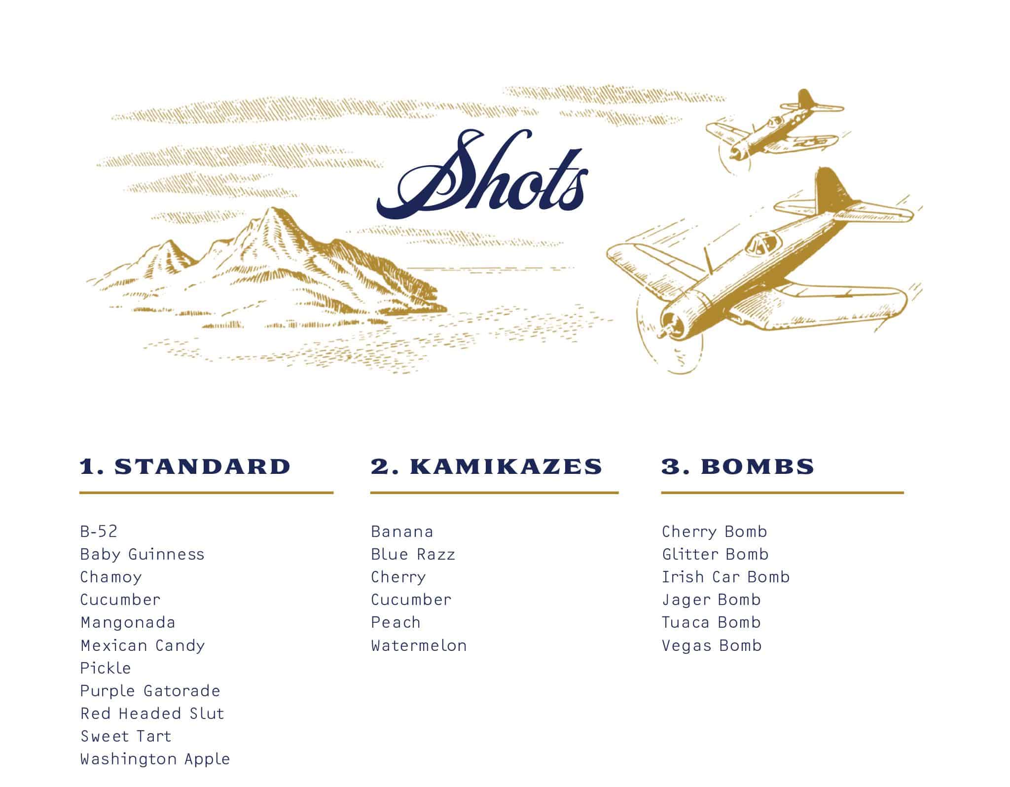 Shots Menu | Brand development, signage, and graphic design for Aero Crafters Beer Garden & Gastropub, Victoria, Texas | Field of Study: A Design & Branding Consultancy.